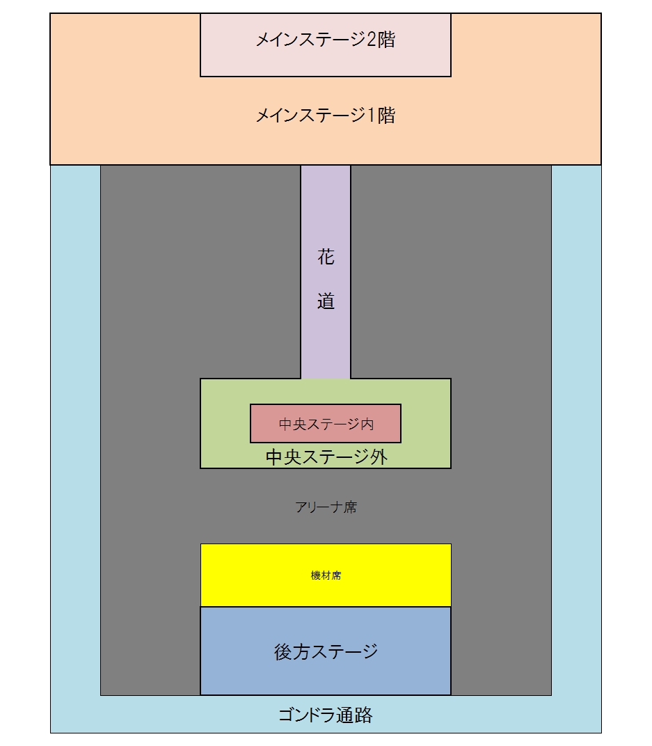 今回の会場はさいたまスーパーアリーナということで、前回のパシフィコ横浜とキャパベースで比べて4倍以上の大きさがあるわけです。SSAだと例えば普通に前のステージ+花道位だとアリーナ後列は比較的悲惨なことになるのですが、今回のステージは